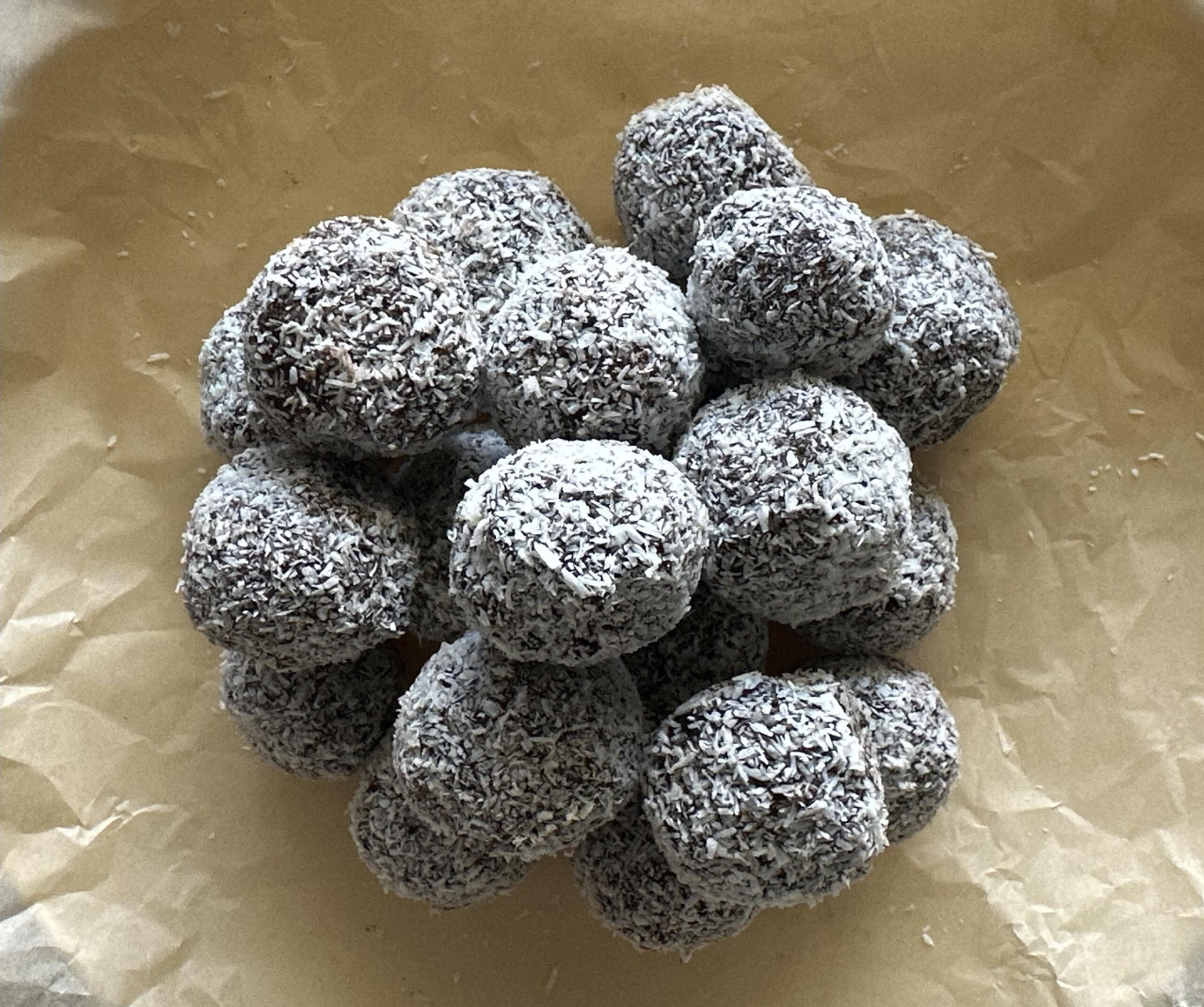 בצלחה רחבה שופכים קוקוס, מניחים את הכדורים על הצלחת ומגלגלים את הכדורים