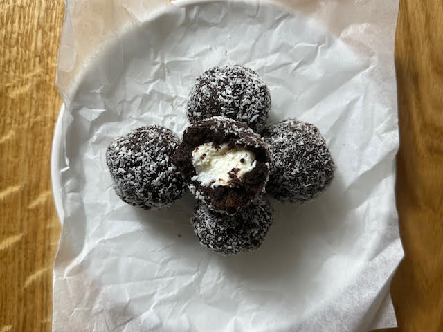 בצלחה רחבה שופכים קוקוס, מניחים את הכדורים על הצלחת ומגלגלים את הכדורים