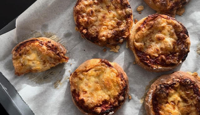מורחים על כל עיגול רוטב פיצה ומפזרים מעל גבינה.
